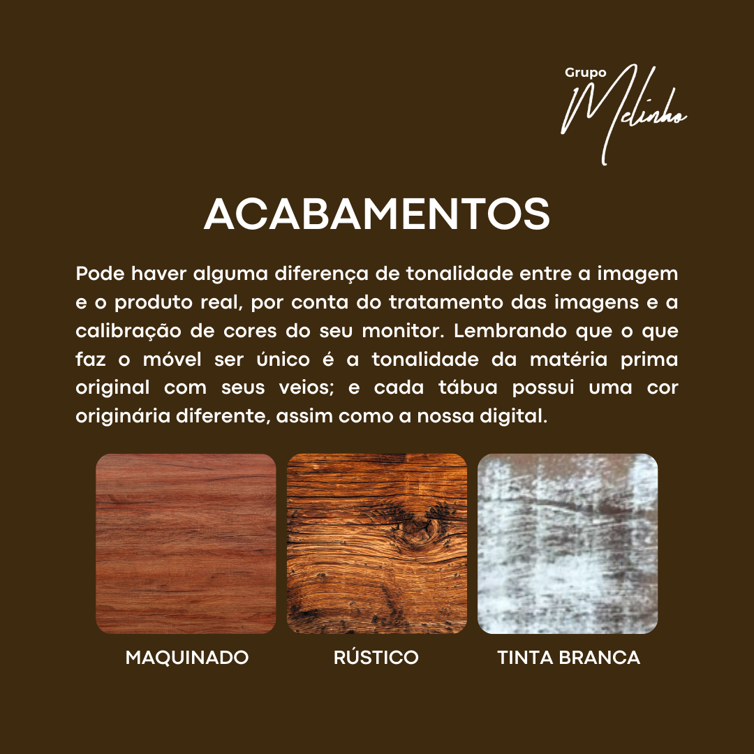 O acabamento é feito manualmente para valorizar os veios naturais da madeira, conferindo um toque rústico e sofisticado. Para maior proteção contra umidade e intempéries, cada peça recebe uma camada de selador e verniz, garantindo durabilidade sem comprometer a estética do móvel.